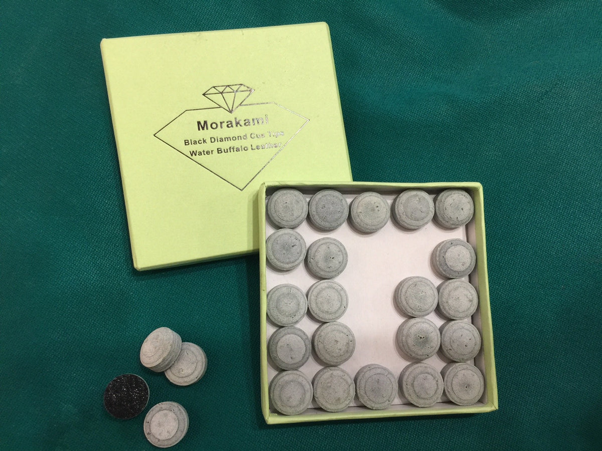 These are the Morakami Black Diamond 8 layer Water Buffalo Cue Tips. They are 8 layers of high grade leather, 14mm and pre-domed. They transfer more spin and control over other similar tips and really hold chalk well.