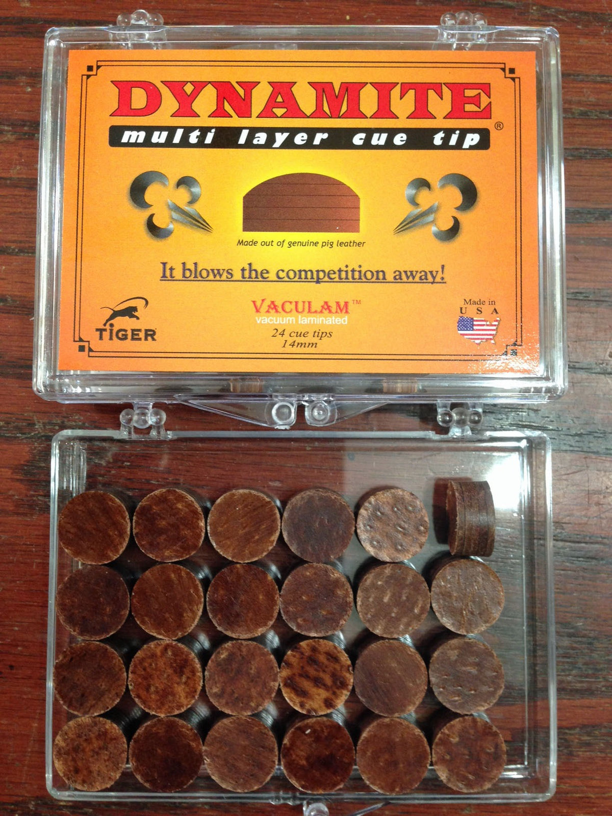 Tiger Dynamite cue tips at low prices and great reviews -- These are a hard cue tip and are a very consistent cue tip with good control. Dynamite multi layer cue tip is made out of five layers of pig leather and treated to a specific hardness naturally. Laminated with VACULAM™ process, Dynamite cue tip is the best priced laminated cue tip for it's quality and durability. This tip is the ideal tip for cue makers and manufacturers as the standard tip for their line of cues. When you play with Dynamite multi layer cue tip, IT BLOWS THE COMPETITION AWAY!!
