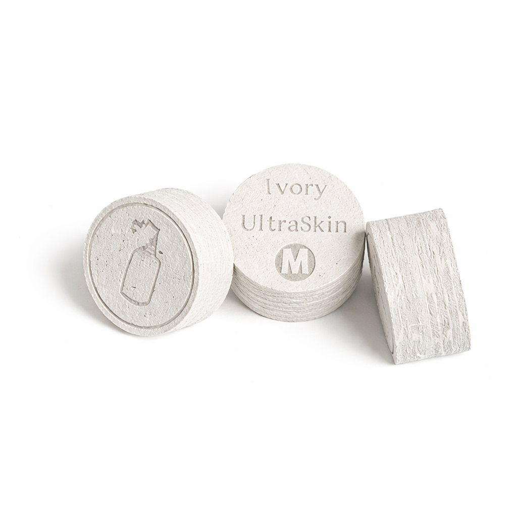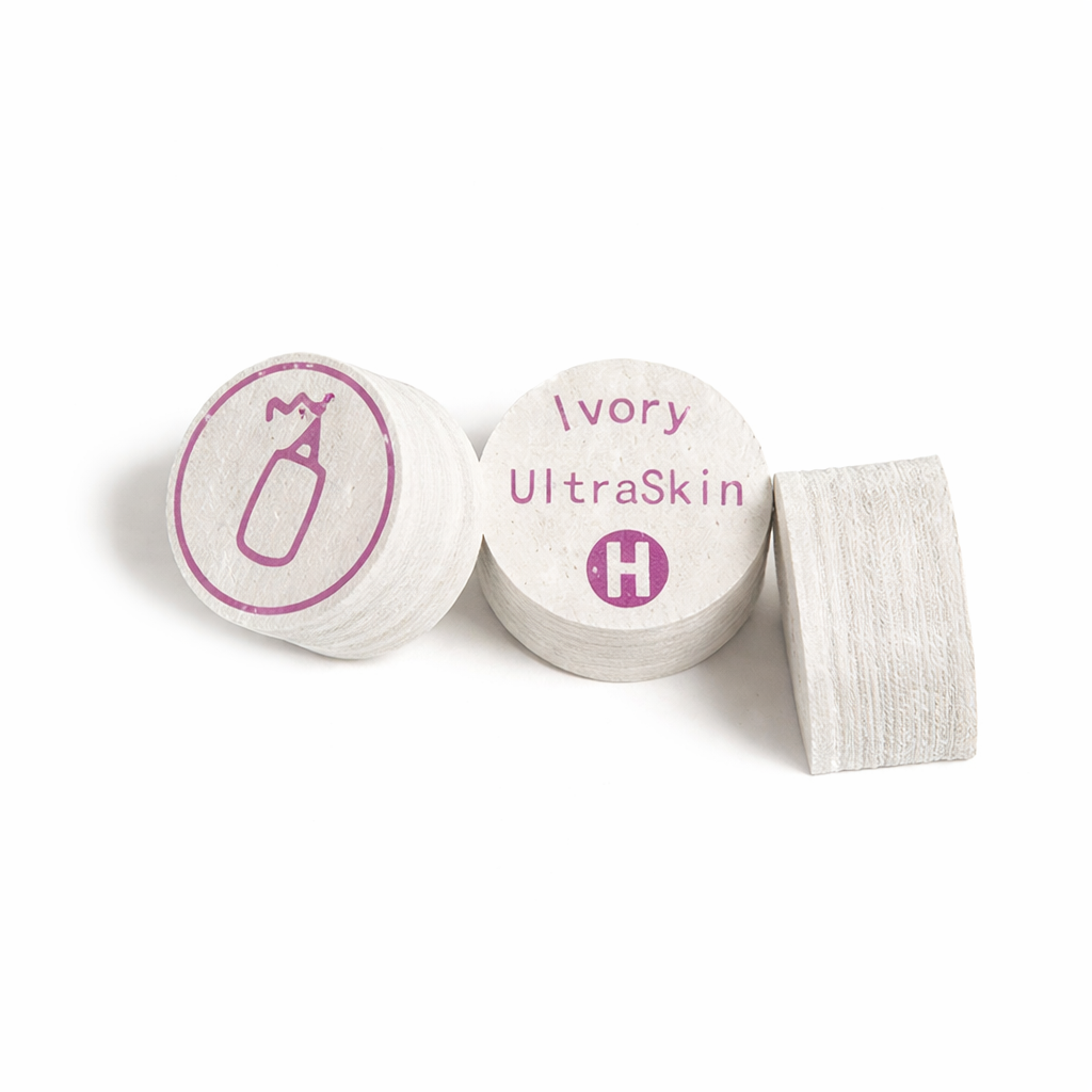 Each piece of leather is inspected and shaved to exact size. All the layers are put through a proprietary treatment and each layer is coupled with proprietary resins so each Ultraskin Layered Cue Tip will give the player the same feel and hit each time.